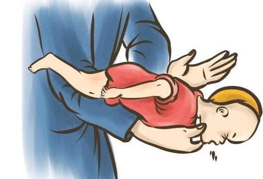 救護人應當立刻把孩子抱起來,一隻手捏住孩子顴骨兩邊,手臂貼著孩子的前胸,另一隻手托住孩子後頸部,讓其臉朝下,趴在救護人膝蓋上。在孩子背上拍1-5次,並調查孩子是不是將異物吐出。