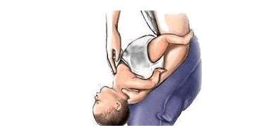 能夠採納別的一個姿態,把孩子翻過來,躺在堅固的地上或床板上,搶救者跪下或立於其足側,或取座位,並使患兒騎在搶救者的大腿上,面朝前。搶救者以兩手的中指或食指,放在患兒胸廓下和臍上的腹部,迅速向上重擊壓榨,但要很輕柔。重複,直至異物排出。