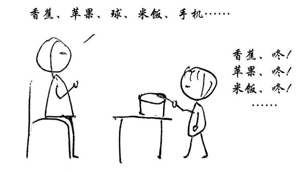 比如:吃的東西。父母有節奏地說出一系列物品的名稱:蘋果、汽車、手機、霜淇淋、糖果、電扇……