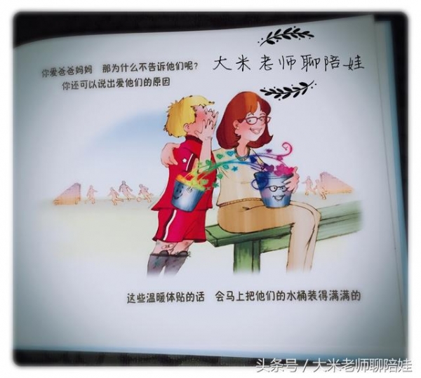 5歲以下的孩子建議可以玩一個親子游戲,叫做“給你的水桶加滿水”。我會準備2個水桶,彩紙和筆,邀請孩子和我畫一些笑臉,剪一些愛心放到對方的水桶裡,直至加滿。其實就是一個“實體化”的水桶,看得見摸得著,讓孩子真切的感受到自己有能力為對方做點兒什麼的同時,自己的水桶也被加滿的過程。