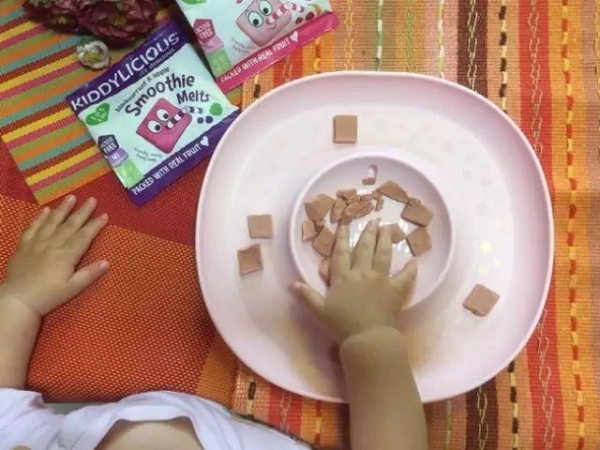 方法:建議寶媽把溶豆掰成小塊,放進一個盤子裡,讓寶寶大把去抓,即使溶豆散落在外面也沒關係,TA在努力的鍛煉手眼腦協調呢。