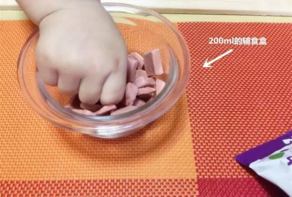 方法:把一顆一顆的溶豆,放進深度約3厘米以上的杯子或小碗裡,大約如圖這麼小的碗,寶媽可以在旁邊引導和鼓勵。既不要讓寶寶挫敗,也不要完全幫忙。