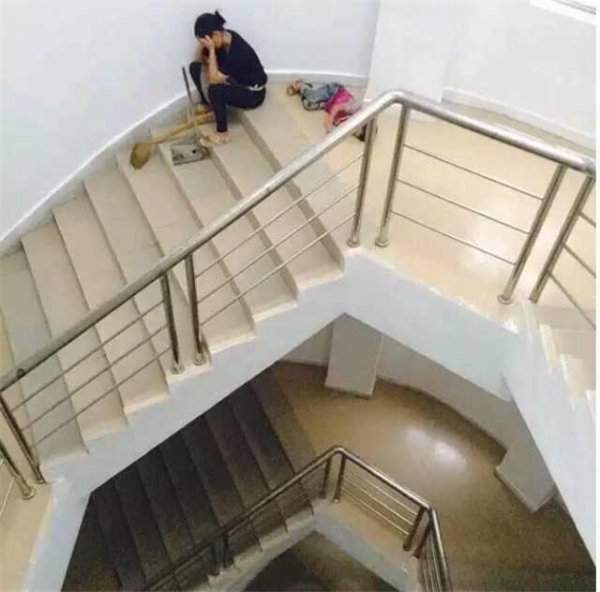 1、樓梯間的保潔大姐,打掃完衛生後看著躺在地上熟睡的孩子哭了!試問哪個父母不想把最好的條件給孩子、試問哪個父母看著孩子睡在冰涼的地上不會心疼,可是現實就是如此,這位保潔大姐又能改變什麼,只能選擇哭泣這種最原始的發洩方式了!