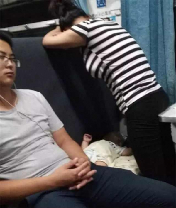 2、父母總希望把最好的給孩子,圖中的母親買的晚上的硬座,為了孩子睡的舒服,她自己用這個姿勢護著孩子12個小時。