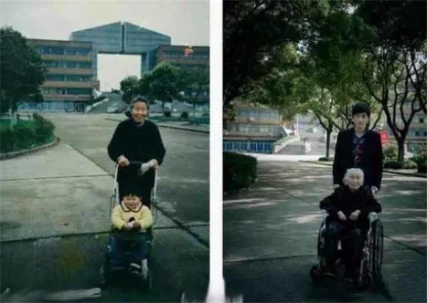 4、20年前,奶奶推著嬰兒車裡的孫子。20年後,同樣的位置,孫子推著輪椅上90歲的奶奶。20年後匆匆過去,我們都長大了,奶奶們卻都老了。這一刻貓爸想起了一段歌詞:時間都去哪兒了,還沒好好感受年輕就老了,生兒養女一輩子,滿腦子都是孩子哭了笑了,時間都去哪兒了,還沒好好看看你眼睛就花了,柴米油鹽半輩子,轉眼就只剩下滿臉的皺紋了!