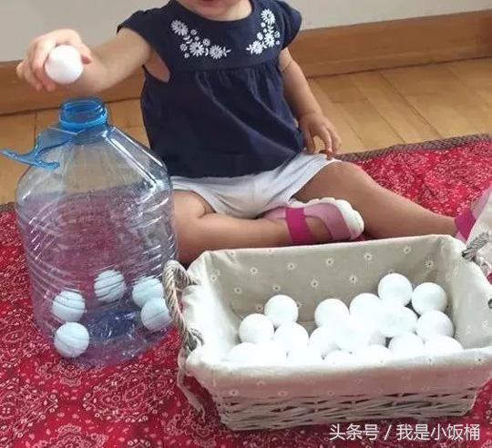 △ 把乒乓球或泡沫球放在籃子裡,讓寶寶用手一個一個放進瓶子