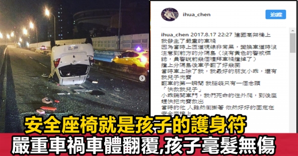 日前,有位媽媽在IG上分享自己遭遇車禍的過程,當時整輛汽車是翻覆的狀態。網友媽咪和她的朋友奮力地爬出了車外,卻發現孩子雖是倒掛著的狀態,依然好好的固定在安全座椅上,且完全沒受到任何傷害!