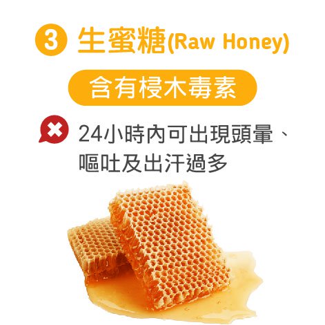 一些未經過高溫消毒和殺菌的生蜜糖(Raw Honey)含有梫木毒素(Grayanotoxin)毒素,成人吃一茶匙,在24小時內可能會出現頭暈、嘔吐及出汗過多等中毒的徵狀,所以幼兒更加不適合服用。