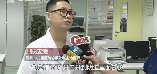 深圳市兒童醫院泌尿外科主治醫師張應添:「就是她那個腎本來發育不好,然後她腎下面連接一個輸尿管,輸尿管正常位置是連接到膀胱裡面去,它走錯路了,開口開到[陰.道]裡面去了,所以她的尿就會從[陰.道]那邊冒出來。」